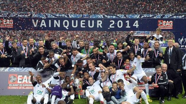 2014 marque l’heure de la revanche pour le Stade Rennais. Après avoir écarté le Sco d’Angers au stade précédent, les hommes de Philippe Montanier retrouvent de nouveau l’En Avant de Guingamp pour un remake de la finale de 2009. Cinq ans après la terrible désillusion, les supporters espèrent pouvoir enfin tourner cette page douloureuse et remporter un trophée. Mais les joueurs vont passer complètement à côté de cette finale. Le déchet dans le jeu est affligeant et la finale est à sens unique. La bande à Jocelyn Gourvennec ouvre la marque à 10 minutes de la mi-temps par l’intermédiaire de Martins Pereira avant que Moustapha Yatabaré double le score au retour des vestiaires, d’une tête rageante au milieu d’une défense complètement apathique. Sonné, le Stade Rennais ne parviendra pas à répondre à des costarmoricains largement supérieur dans cette finale. Il s’incline pour la troisième fois dans une finale en 5 ans et la résignation des supporters se fait de plus en plus ressentir.